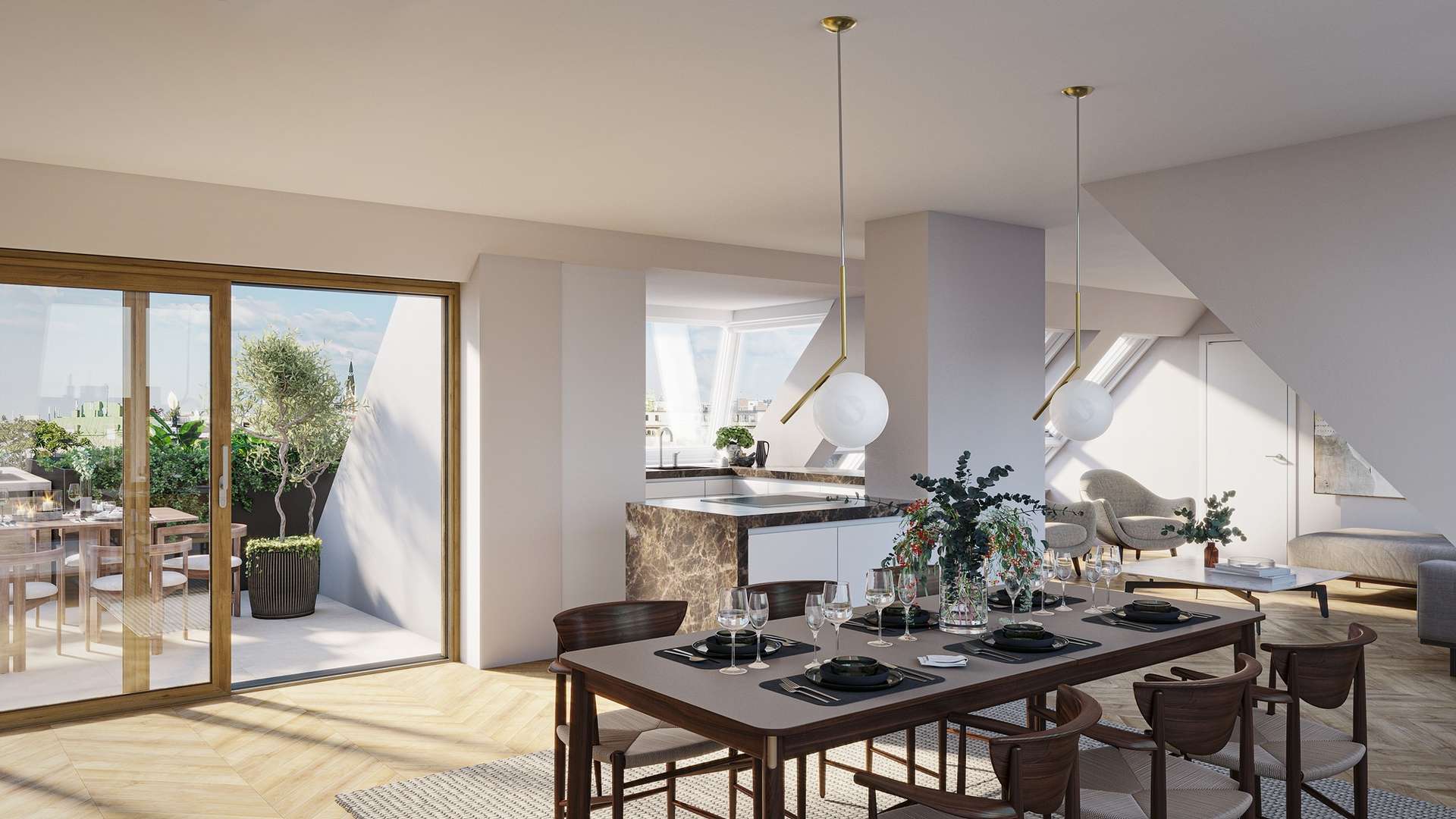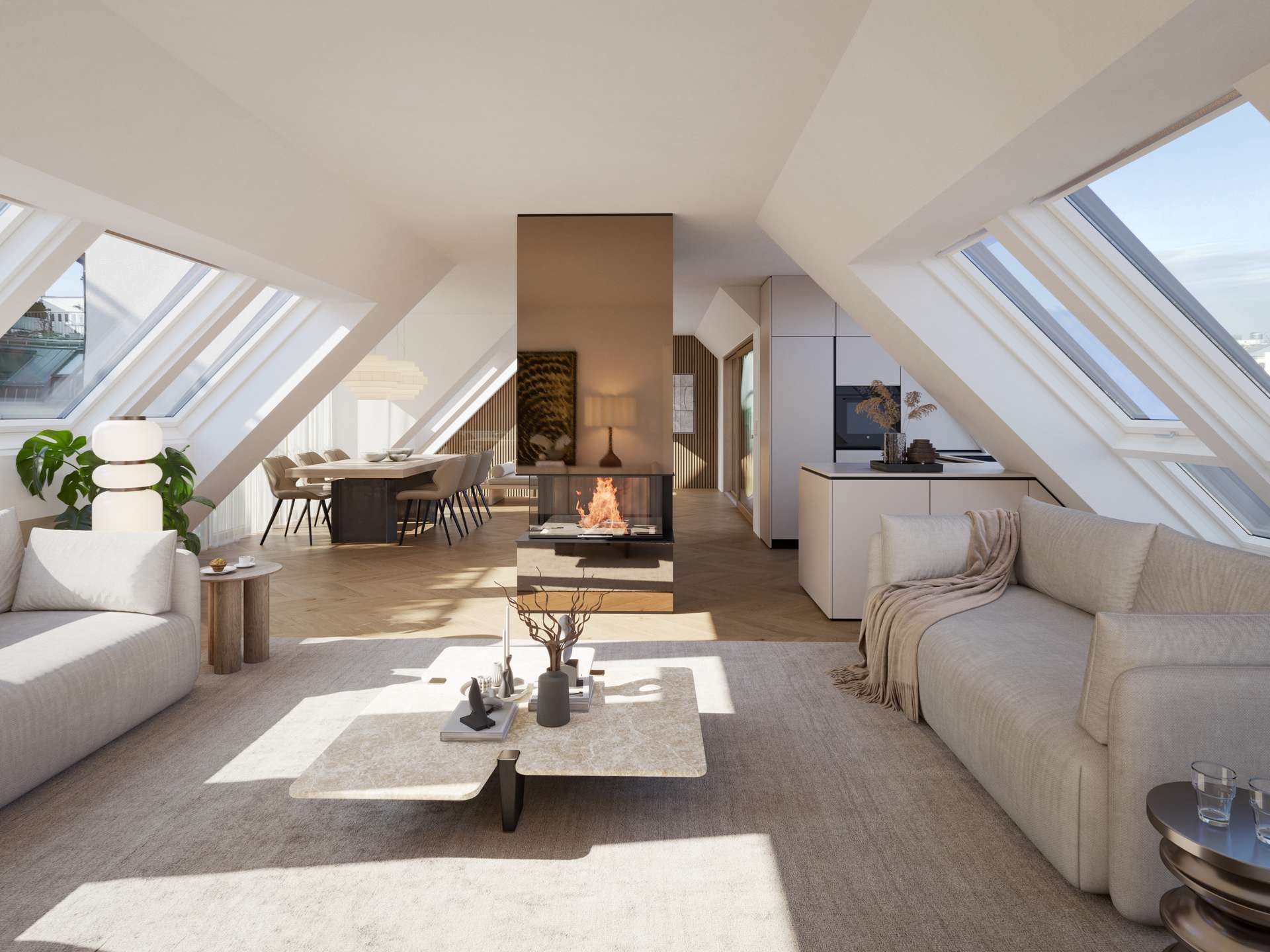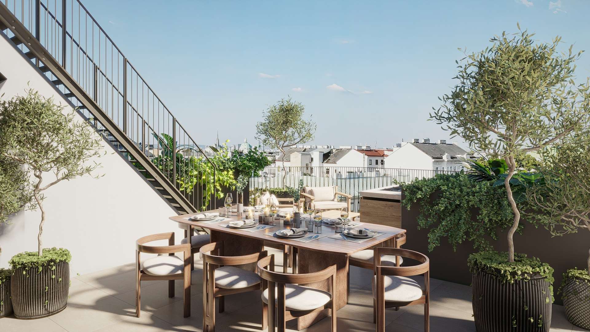 Das Highlight dieser Wohnung ist die beeindruckende 32,98 m² große Dachterrasse, die einen einzigartigen Panoramablick über die Dächer Wiens, den Stephansdom, die Karlskirche sowie das benachbarte Palais Schönburg bietet – ein exklusiver Rückzugsort über der Stadt. Die drei Schlafzimmer sowie die zwei Badezimmer befinden sich im unteren Geschoss der Wohnung. Die Badezimmer sind mit hochwertiger Sanitärkeramik von Laufen ausgestattet, mit Fliesen von Villeroy & Boch ausgekleidet und verfügen über eine Dusche und/oder Badewanne, um eine perfekte Balance aus Design und Funktionalität zu gewährleisten. Zusätzlich befindet sich auf dieser Ebene eine 6 m² große Terrasse, die einen weiteren privaten Außenbereich bietet. Das obere Geschoss beherbergt den großzügigen Wohn-Essbereich mit integrierter Küche. Dieser lichtdurchflutete Wohnraum wird durch eine 12 m² große Terrasse erweitert. Über eine elegante Stiege gelangen Sie auf die spektakuläre Dachterrasse, die Ihnen ein unvergleichliches Wohngefühl mit exklusiven Ausblicken bietet.