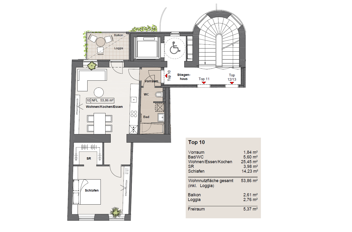 • Balkon + Loggia als kombinierte Außenfläche (gesamt 5,37 m²)