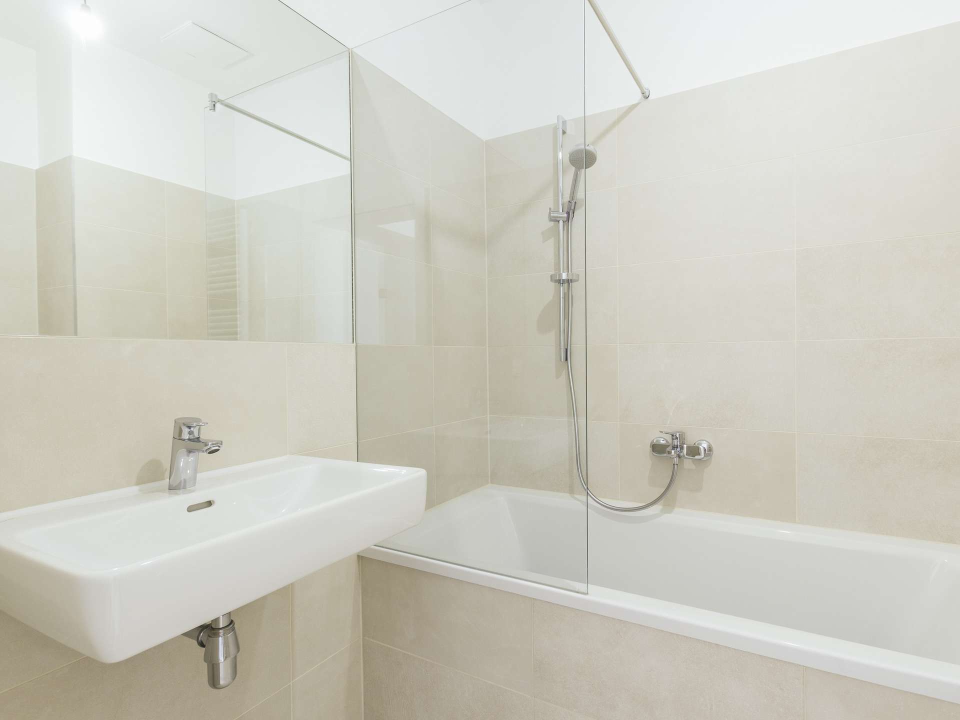 - Design-Bad mit Badewanne, Waschbecken, Handtuchheizkörper und Waschmaschinenanschluss