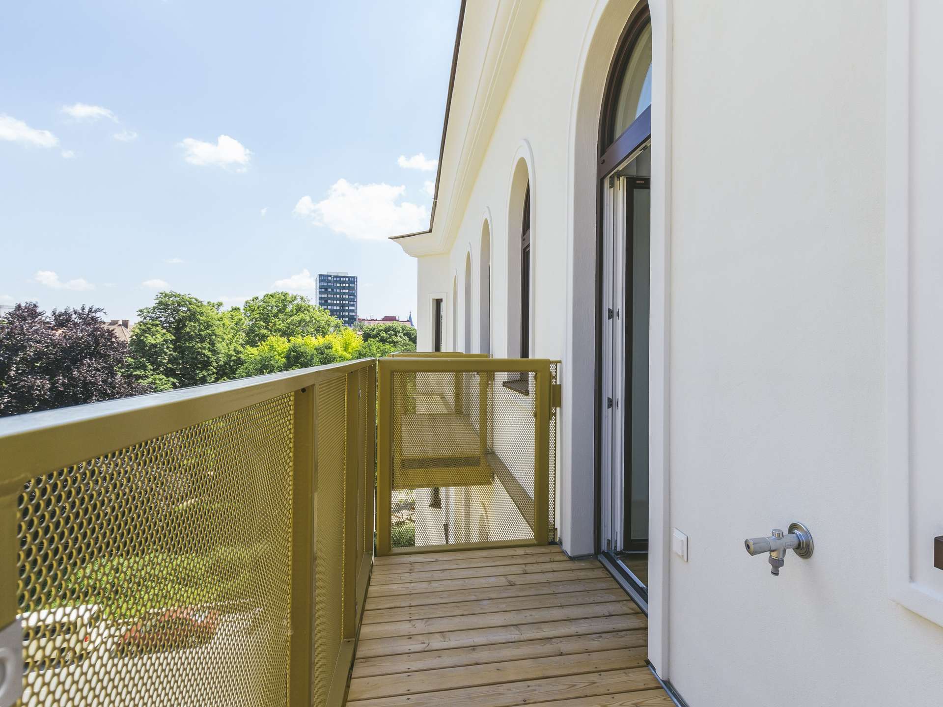 Das prächtige Gründerzeithaus wurde vollständig und hochwertig saniert und um einen 2-stöckigen goldenen Dachgeschoßaufbau erweitert. Goldene Balkone zieren die vormals eintönige Fassade und geben dem Gebäude ein neues Gesicht. Wie Vergangenheit und Moderne harmonisch zu einem eigenen Baustil von zeitloser Eleganz verschmelzen, ist großartig und ein Gewinn für das Stadtbild, in das sich das Gebäude perfekt einfügt.