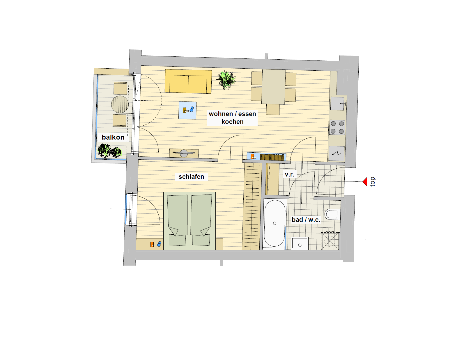 - 2 Zimmer (Wohn-/Essbereich & Schlafzimmer)