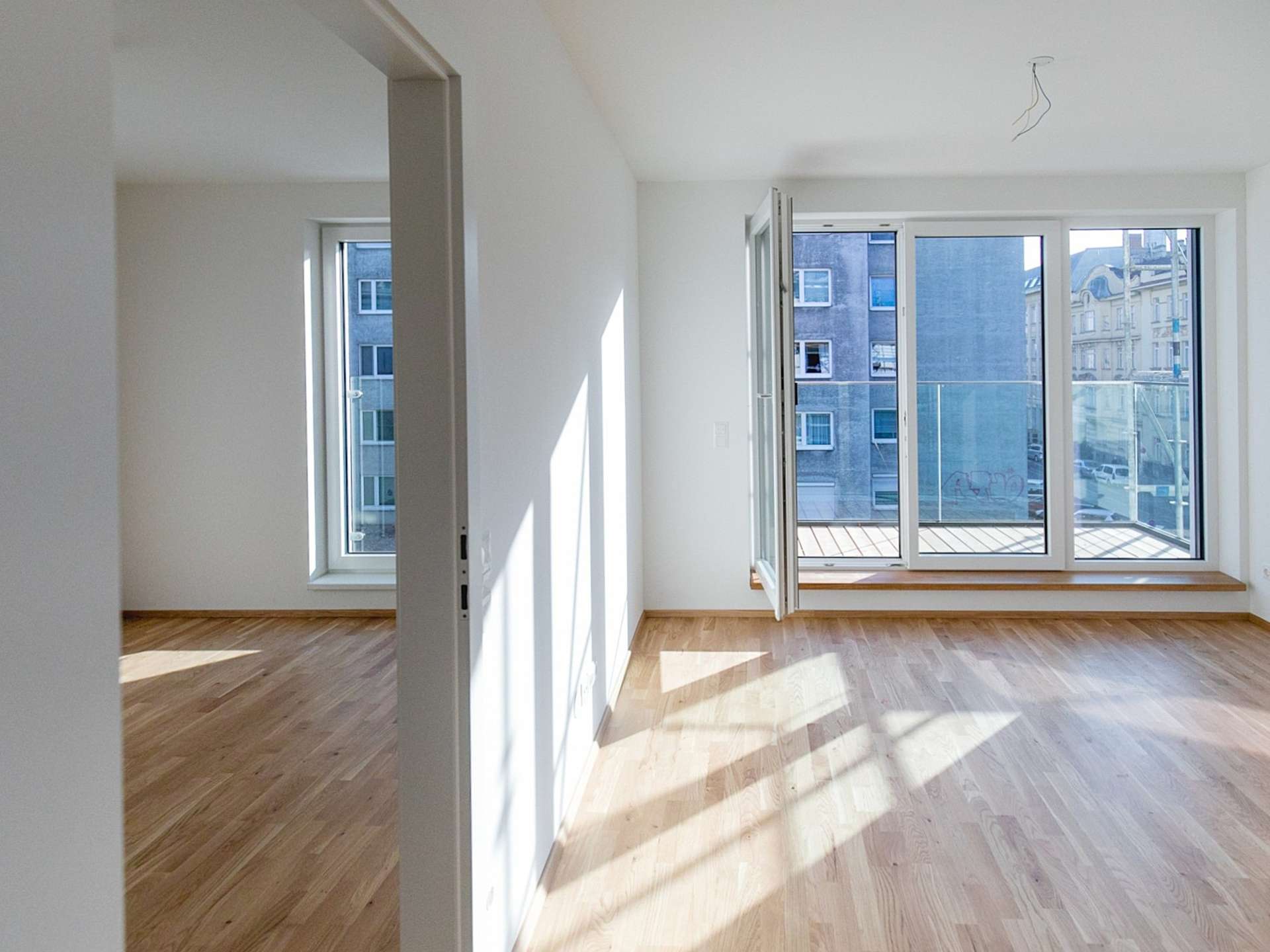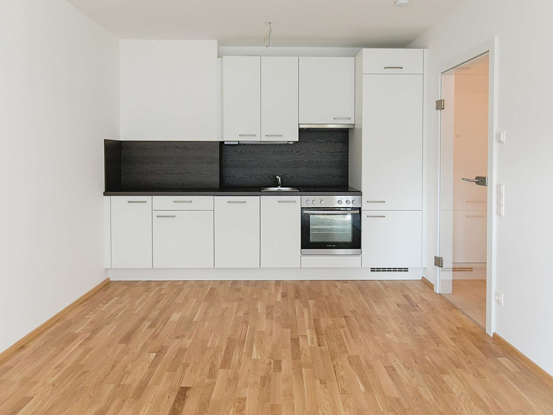Die Wohnung überzeugt mit einem hellen Wohn-/Essbereich inklusive maßgefertigter Küche mit sämtlichen Geräten sowie einem geräumigen Schlafzimmer. Große Fensterflächen sorgen für viel Tageslicht und unterstreichen den modernen Charakter der Wohnung.