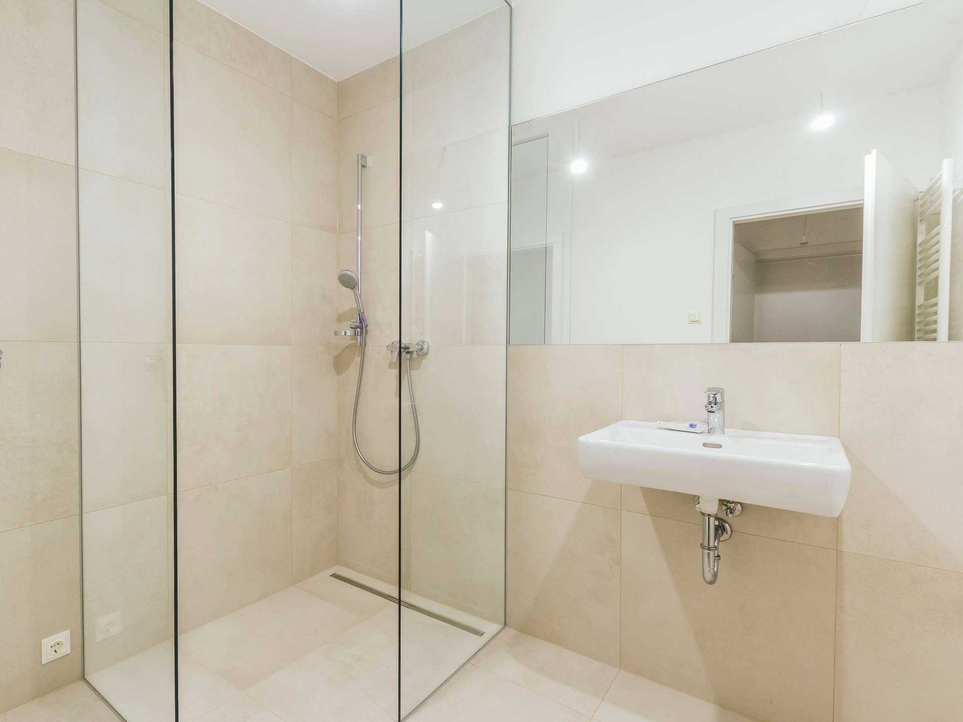 - Design-Bad mit Dusche, Waschbecken, Handtuchheizkörper und Waschmaschinenanschluss