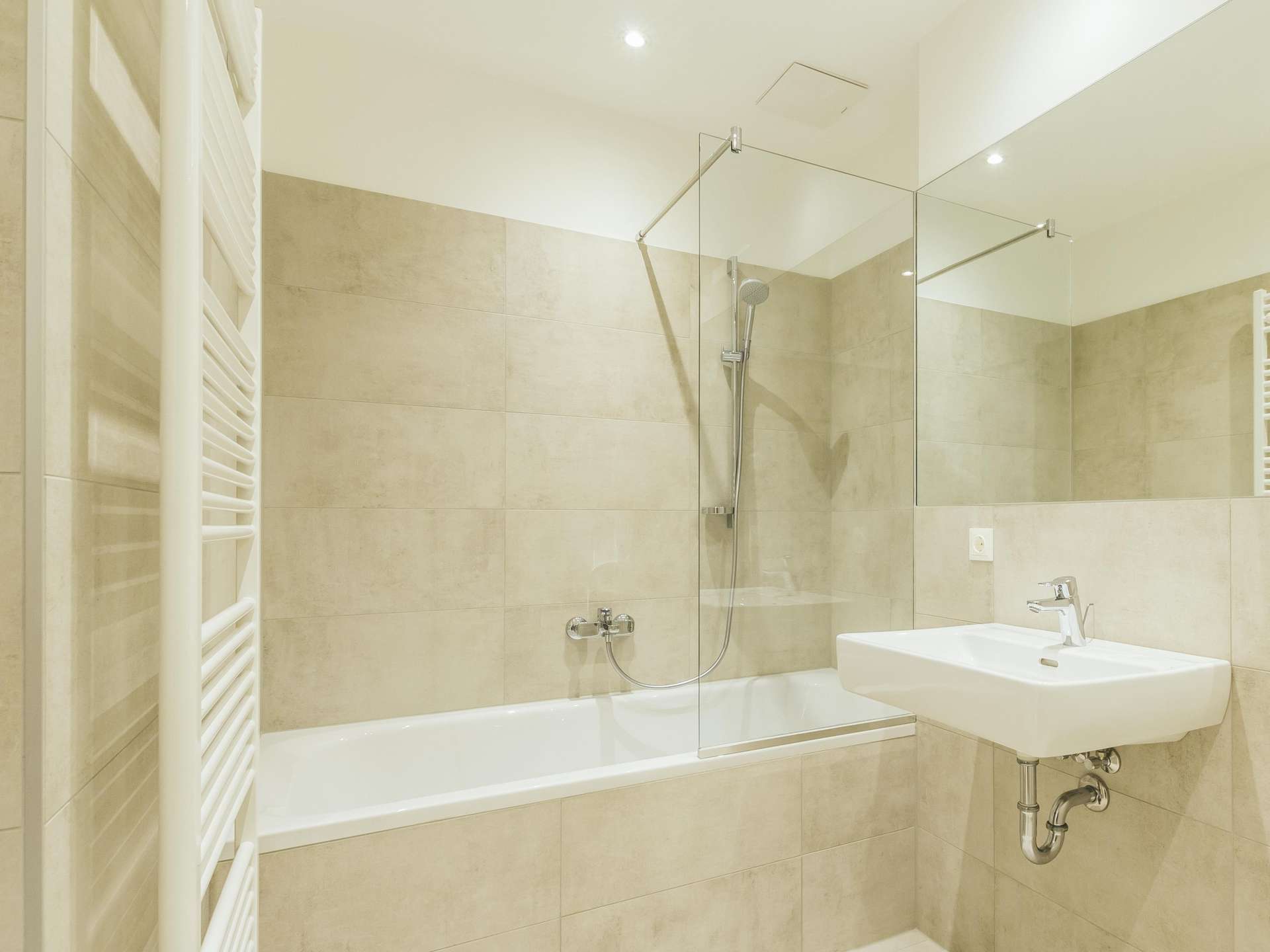 - Design-Bad mit Badewanne, Waschbecken, Handtuchheizkörper und Waschmaschinenanschluss
