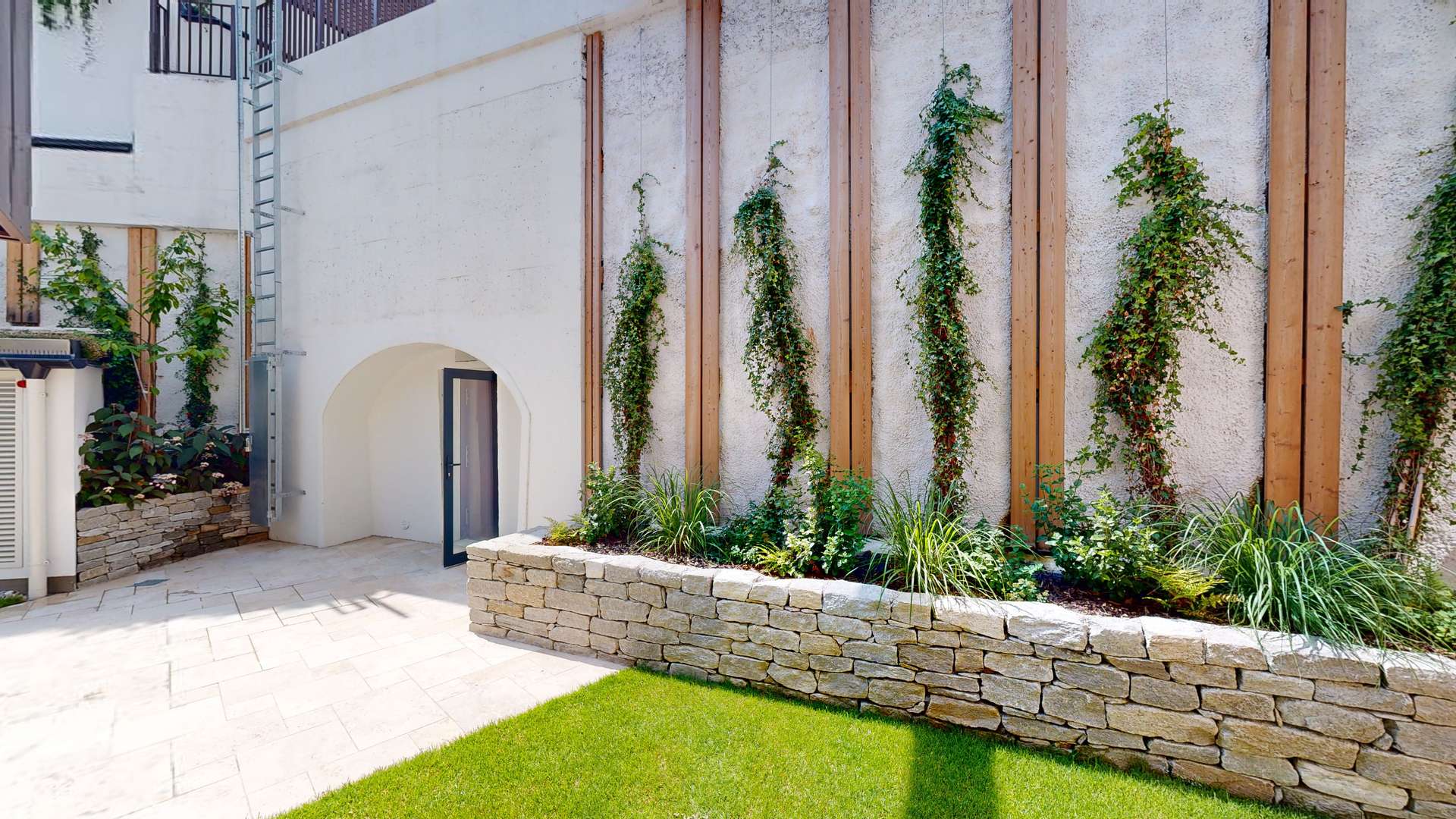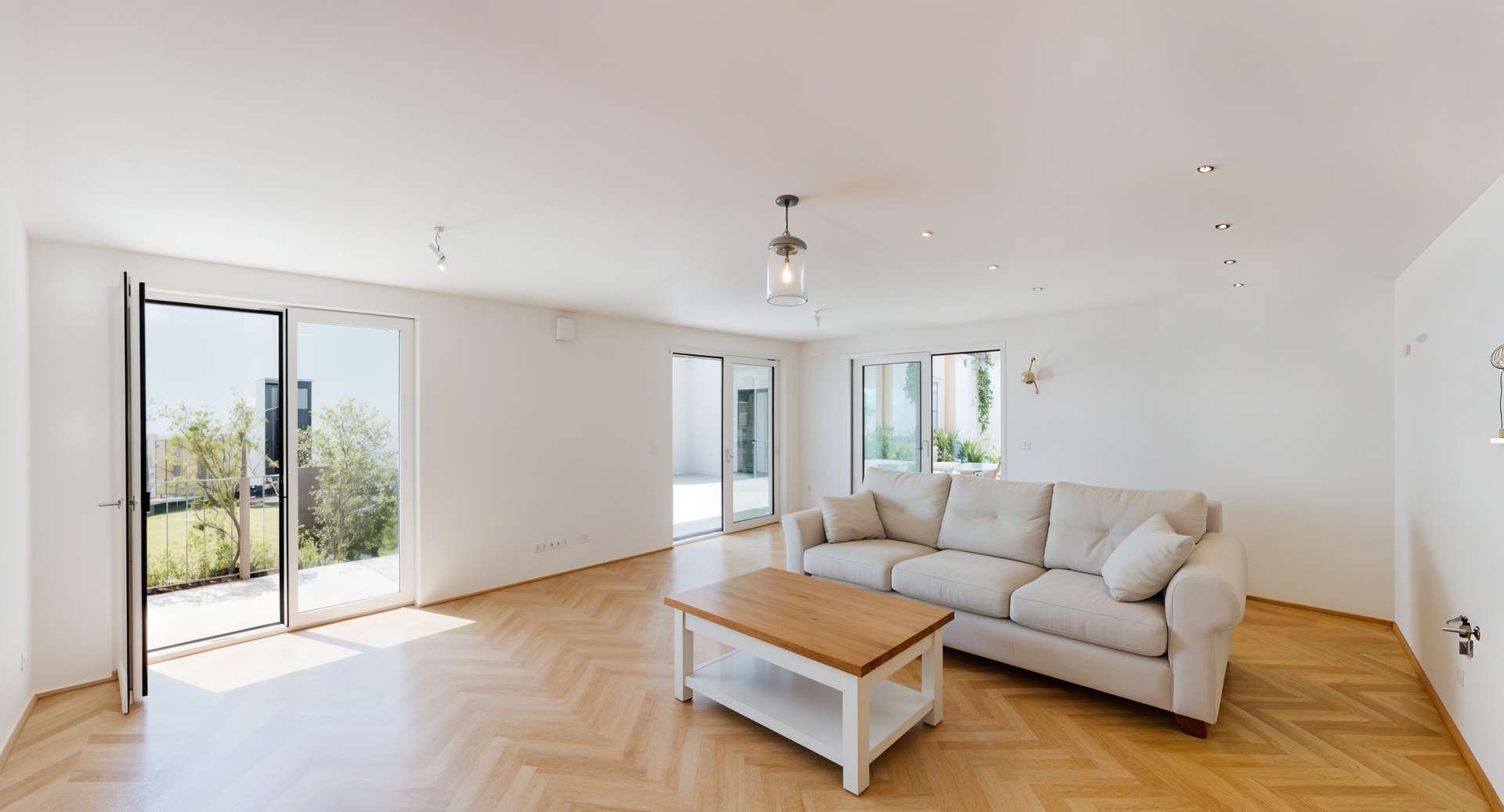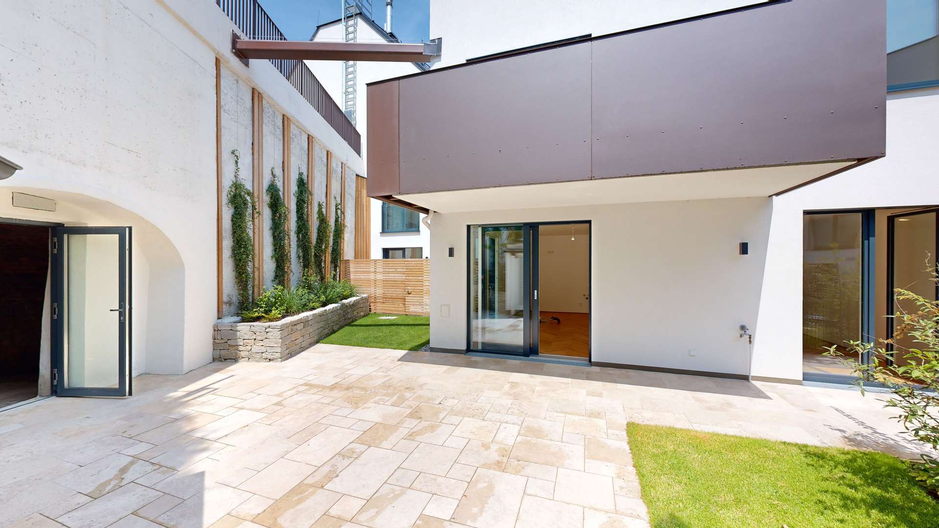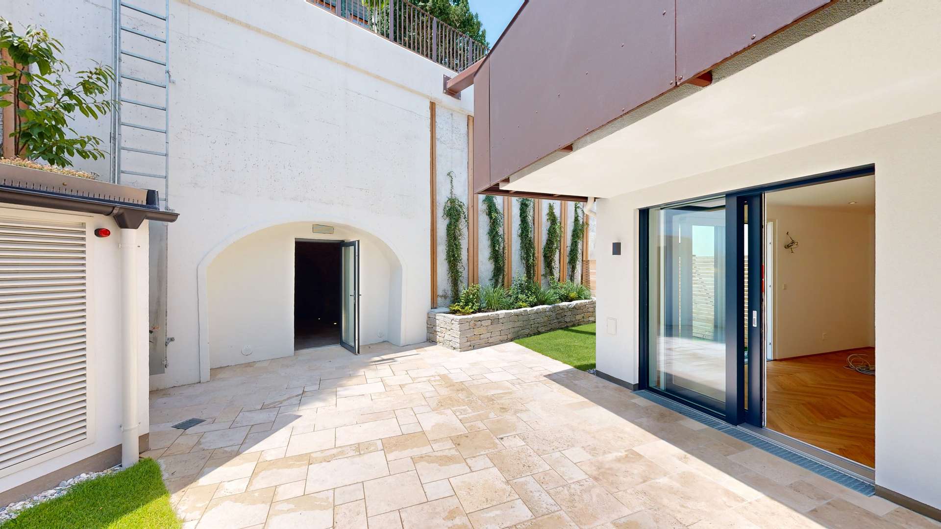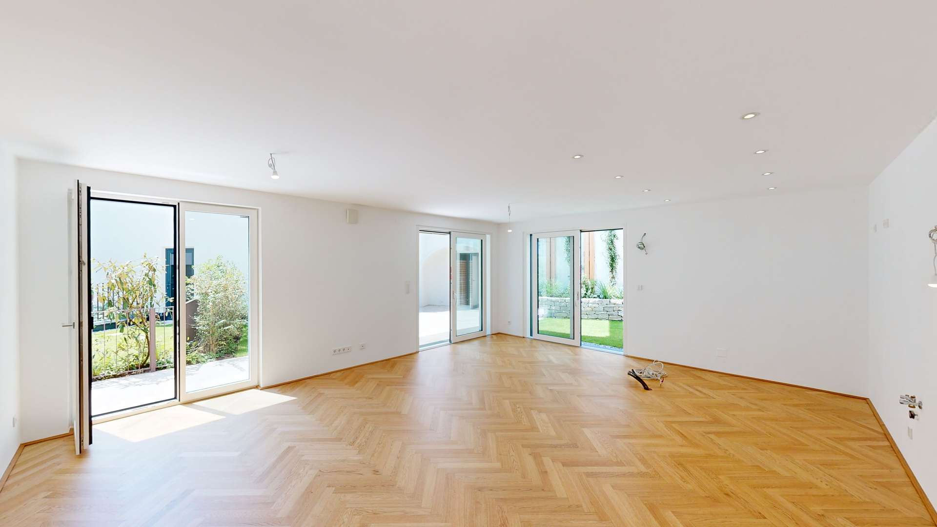 Die 72 m² große Außenfläche, bestehend aus Garten und Terrasse, macht diese vier Zimmer Wohnung zu einer echten Outdoorwohlfühloase. Anschließend an die Terrasse befindet sich ein eigener Gewölbekeller (21,35 m²). Dieser lässt sich als Weinkeller beziehungsweise als Sauna nutzen. Die Terrasse ist über den Wohn- Essbereich betretbar. In diesem sowie in den drei Schlafzimmern ist ein Fischgrätparkett der Qualitätsmarke Scheucher verlegt. Die Badezimmer sind mit Feinsteinzeug ausgelegt sowie mit Keramik der Linie Laufen Pro ausgestattet. Zwei Abstellräume (2,07 m²) in der Wohnung sowie das eigene Kellerabteil (5,39 m²) bieten ausreichend Stauraum.