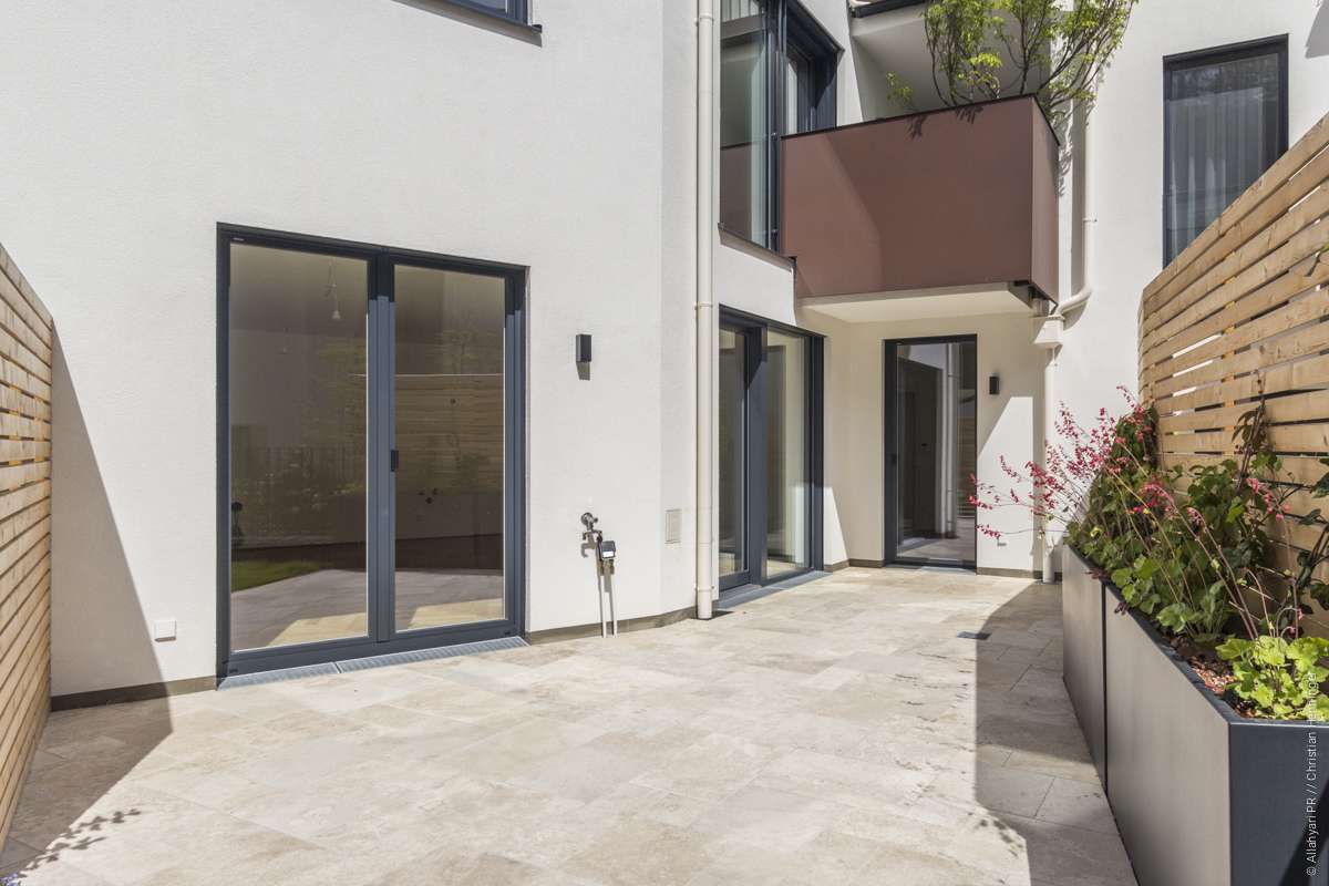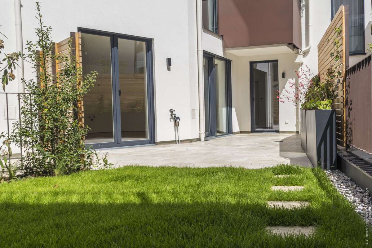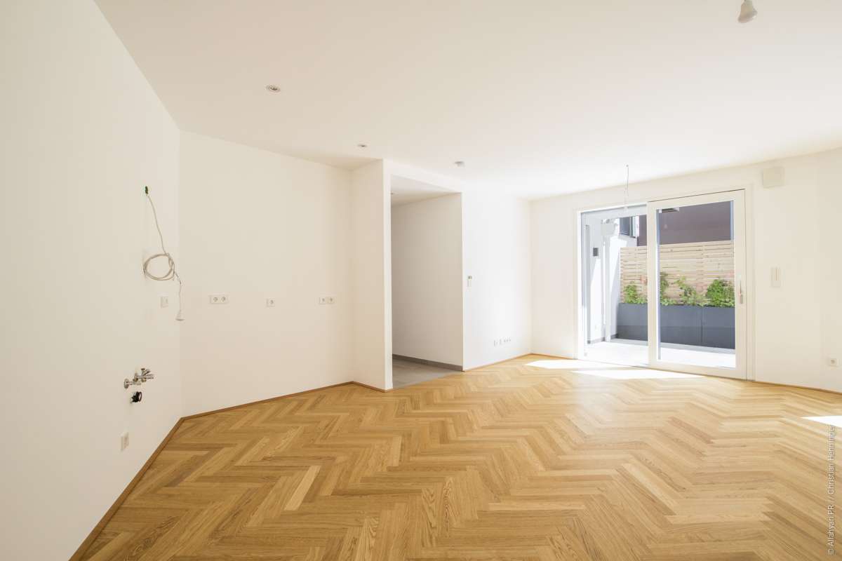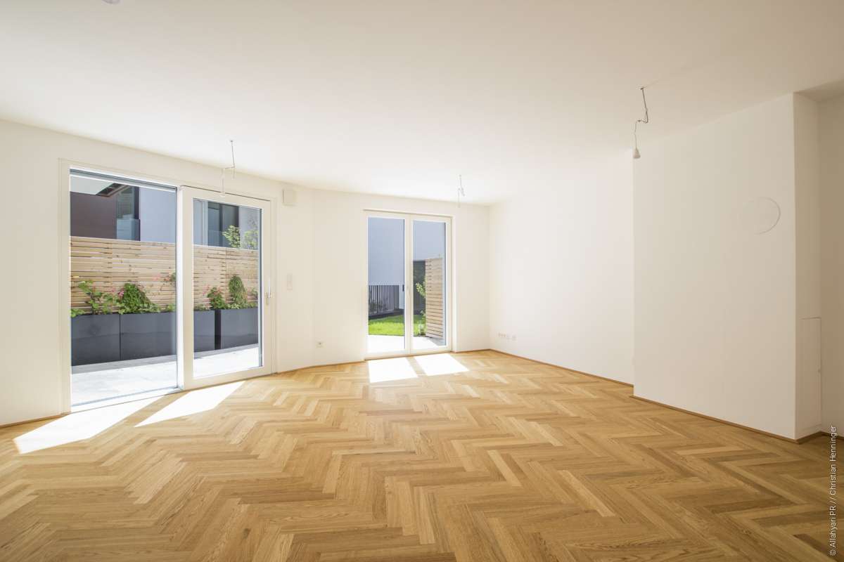 Diese gut aufgeteilte 4-Zimmer Wohnung verfügt über einen großzügigen Außenbereich. Die südseitige Terrasse (22,01 m²) sowie der Garten (18,79 m²) sind direkt mit dem Wohn- Essbereich sowie einem der drei Schlafzimmer verbunden. Im gesamten Wohnbereich ist Fischgrätparkett der Marke Scheucher verlegt. Die zwei Badezimmer sind mit hochwertigem Feinsteinzeug ausgekleidet sowie mit Keramik der Linie Laufen Pro ausgestattet. Neben Stauraum in den einzelnen Schlafzimmern befindet sich auch ein 2,60 m² großer Abstellraum in der Wohnung. Ebenso ist der Wohnung ein 8,19 m² großes Kellerabteil zugeordnet.