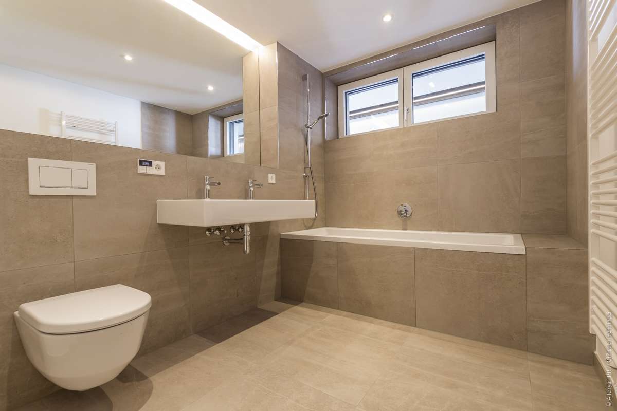 • Badezimmer mit hochwertiger Sanitärausstattung, Dusche und Badewanne Laufen Pro sowie indirekter Beleuchtung