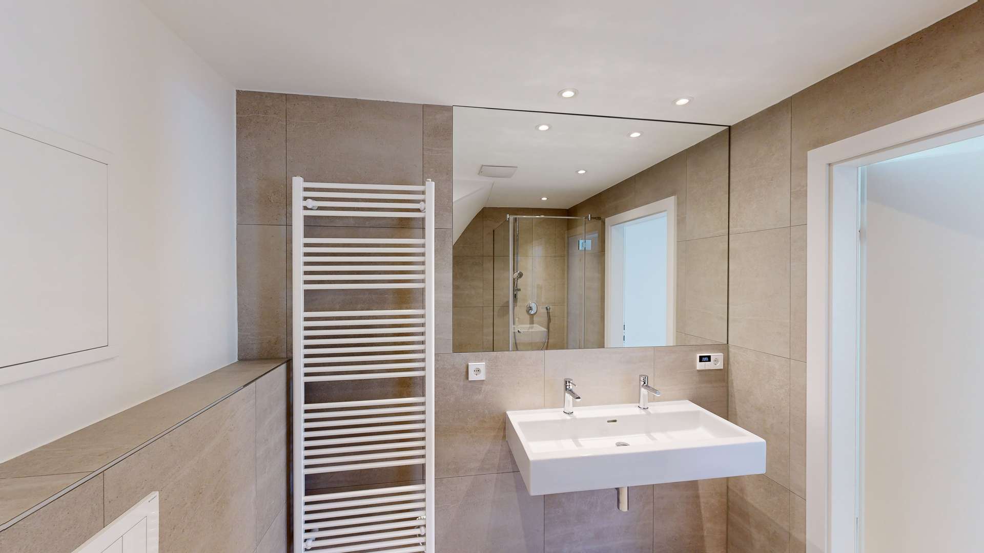 • Badezimmer mit hochwertiger Sanitärausstattung, Dusche und Badewanne Laufen Pro sowie indirekter Beleuchtung