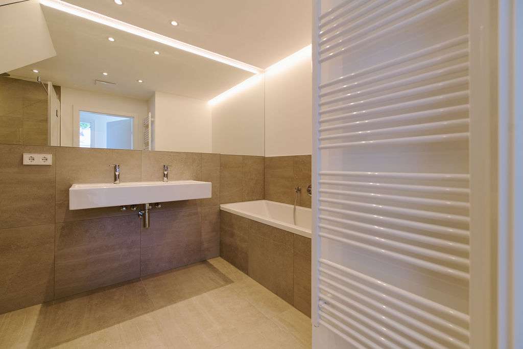 - Badezimmer mit Laufen Pro Sanitärausstattung, Dusche und Badewanne, indirekte Beleuchtung