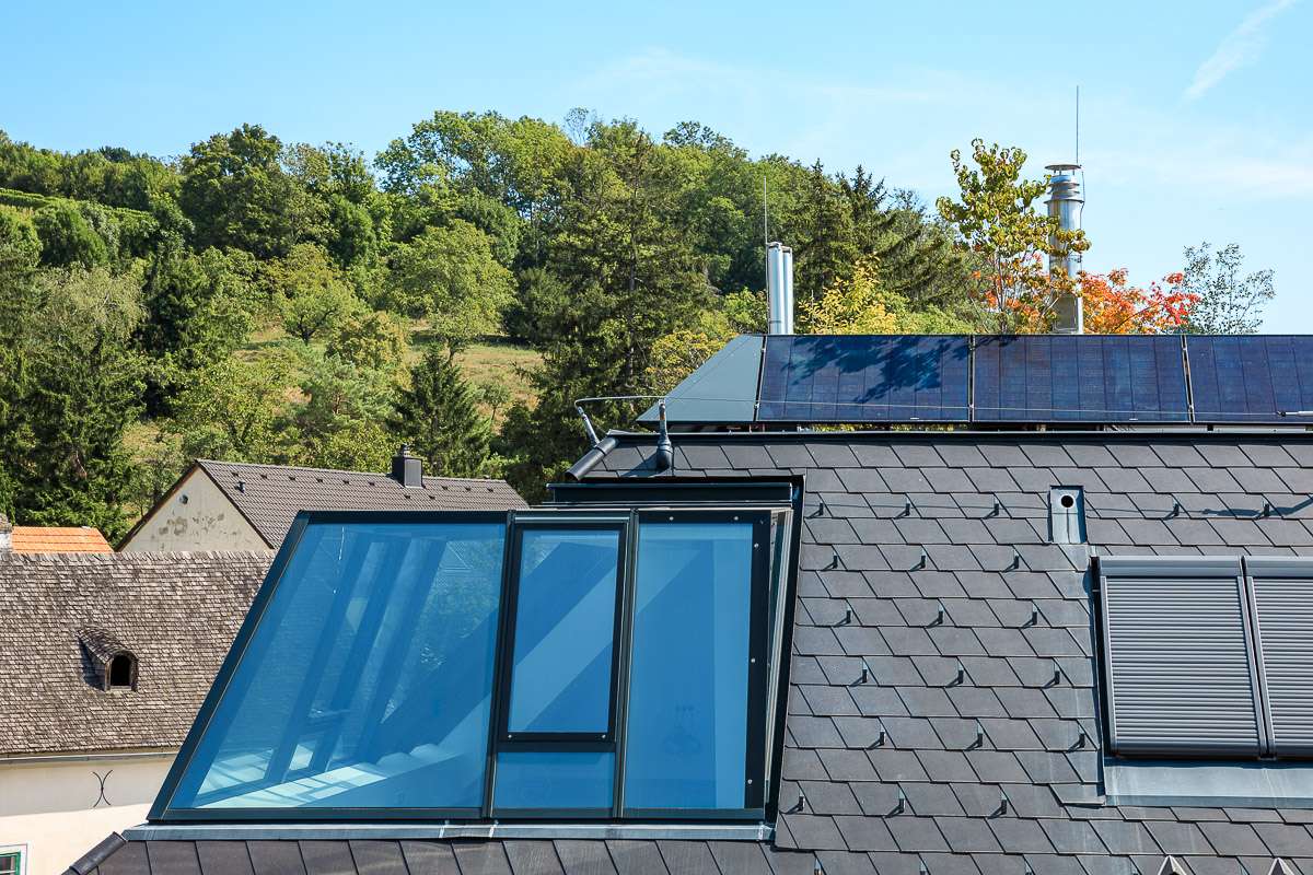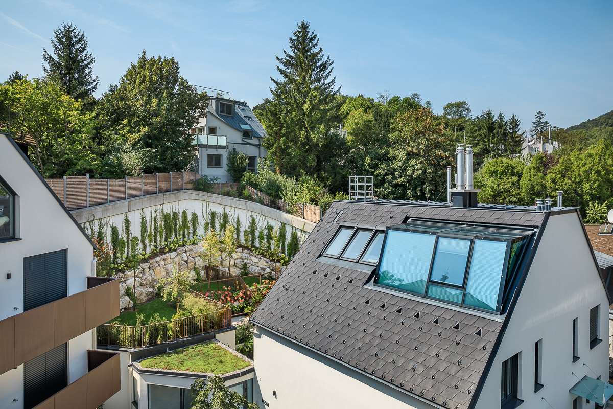 Über den Dächern Sieverings, mit freiem Blick auf die Weinberge des Wienerwaldes – die Dachterrasse dieser Wohnung ist kein Bonus, sie ist der Grund. 27,30 m² privater Außenraum, Stille, Weinreben. Darunter: ein 54,89 m² Wohnbereich unter einer markanten Glasgaupe, die Tageslicht zu einem architektonischen Erlebnis macht.