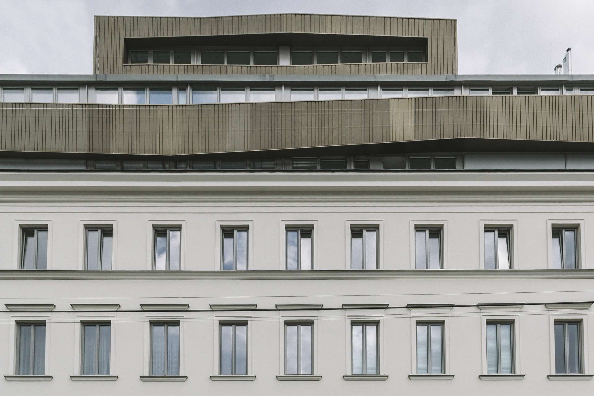 Der einstmal triste Altbau wurde in höchster Qualität saniert und um drei Stockwerke erweitert. Die Lichtreflexe der modernen Fassadenkonstruktion machen jeden Anblick zu einem individuellen Erlebnis - je nach den aktuellen Lichtverhältnissen.