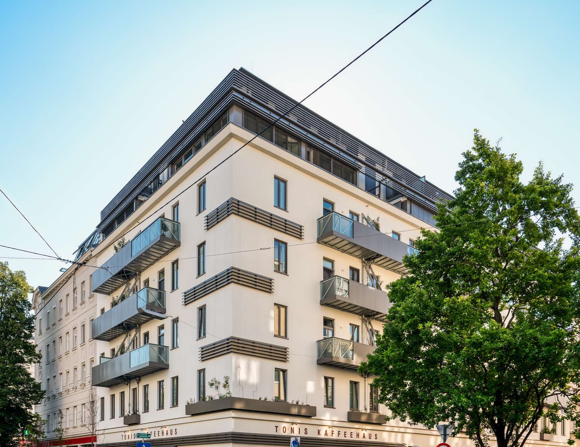Der H-Trakter in der Dreyhausenstraße 9 in Wien Penzing mit zerbombter Fassade und schönen Stuckflächen stellte für uns bei der Sanierung eine besondere Herausforderung dar. Von Außen schlicht und unspektakulär, explodiert das Gebäude beim Betreten förmlich durch seine prachtvollen Stuckschätze. Um den wunderschönen südseitigen Innenhof nutzbar zu machen, entschieden wir uns, hofseitig erstmals Gartenmaisonetten zu bauen – die Ersten in ganz Wien.