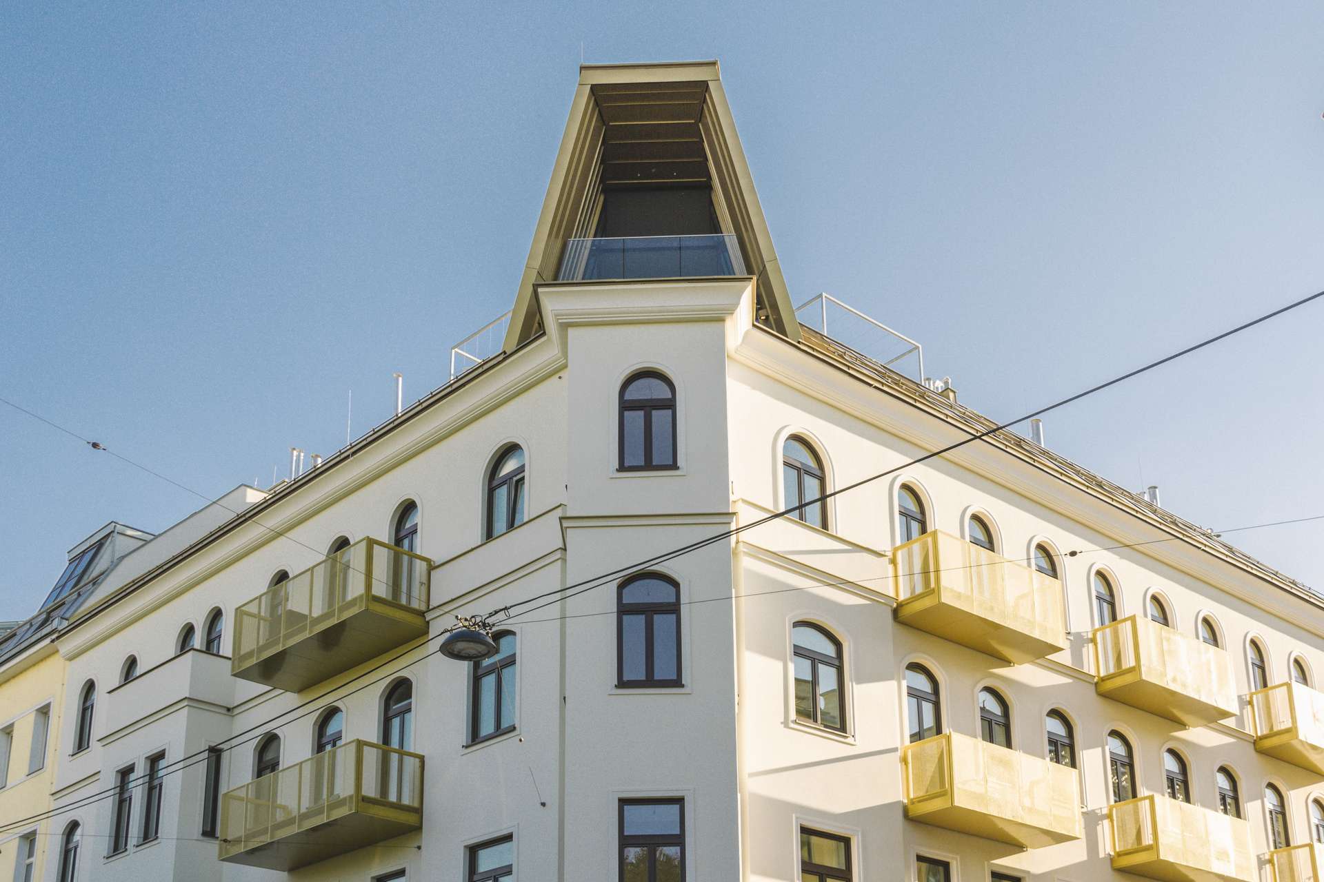 Das prächtige Gründerzeithaus wurde vollständig und hochwertig saniert und um einen 2-stöckigen goldenen Dachgeschoßaufbau erweitert. Goldene Balkone zieren die vormals eintönige Fassade und geben dem Gebäude ein neues Gesicht. Wie Vergangenheit und Moderne harmonisch zu einem eigenen Baustil von zeitloser Eleganz verschmelzen, ist großartig und ein Gewinn für das Stadtbild, in das sich das Gebäude perfekt einfügt.