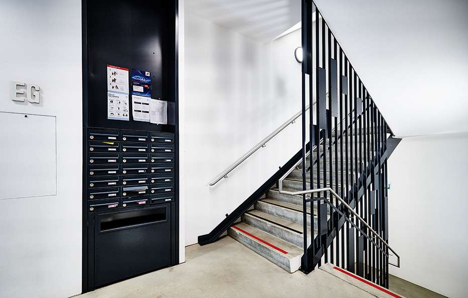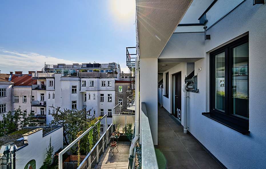 Sichtbetonwände verstärken die Loftpersönlichkeit des Hauses, welches in moderne 2-, 3- und 4-Zimmerwohnungen zwischen 44 und 116 m² mit Eichenparkett, Fernwärmeheizung, Freiflächen und straßenseitiger Außenbeschattung umgebaut wurde. Die Citydomizile wirken dank perfektem Grundriss und moderner Ausstattung großzügig, smart und modern.